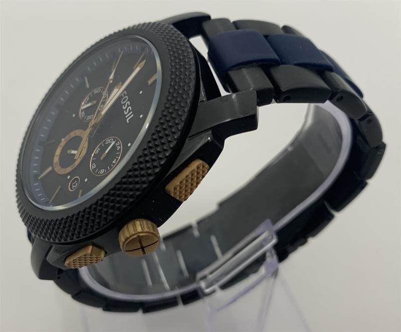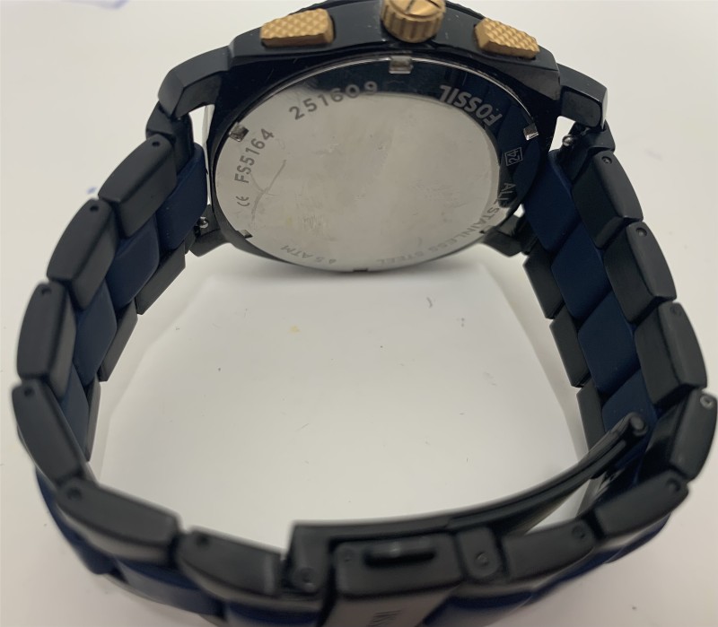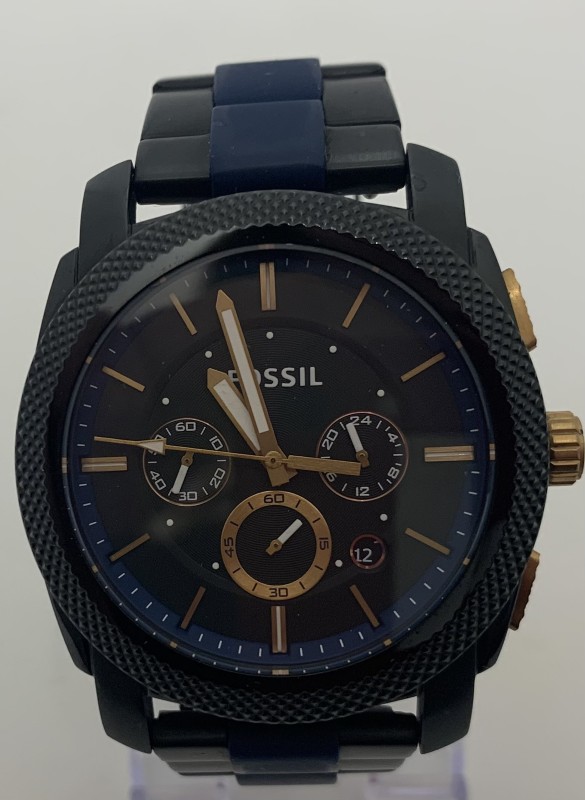 Fossil men's watch Quartz 3 sub dial Chronograph Movement and has day window. 45mm Case Size with 3 link Stainless Steel wrapped in silicone strap. The watch comes in good condition with some cosmetic wear.