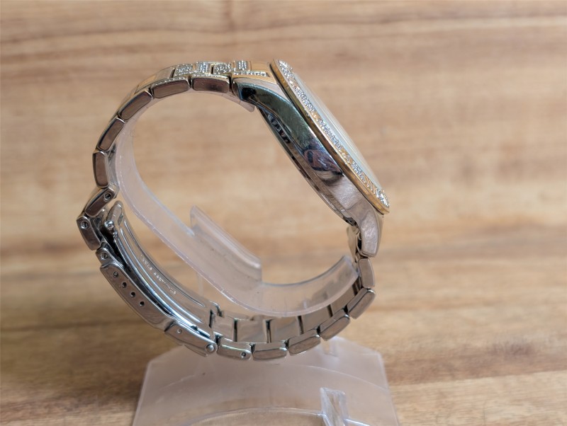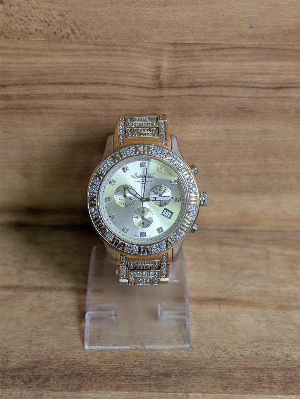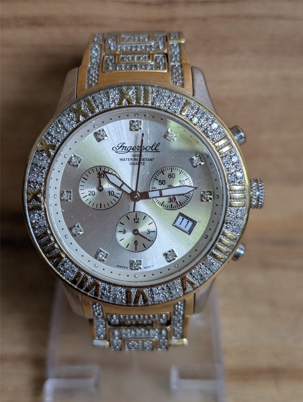 This is the Ingersoll diamond IG0251DM which is 18-carat plated and fits a wrist up to 24cm. The watch is in good condition, there are next to no markings that can be seen around the bezel of the watch, no markings can be seen on the face of the watch either.