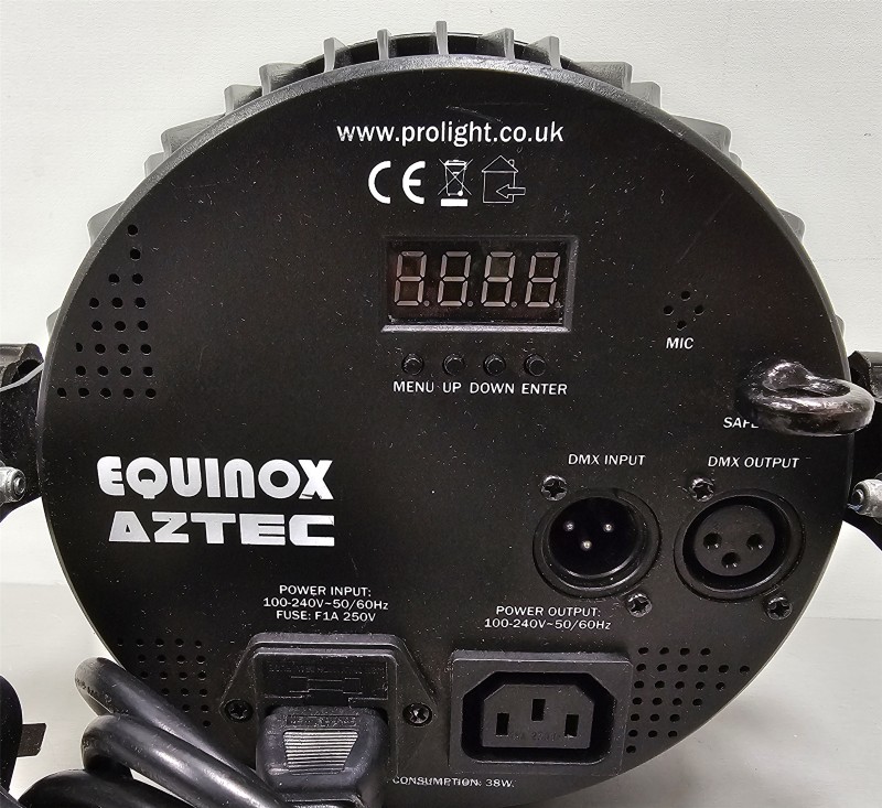 The Equinox Aztec is a powerful and versatile LED wash light featuring three high-output lenses surrounded by a unique Aztec pattern of smaller LEDs for a stunning combined effect. It's built into a heavy-duty, ribbed metal casing perfect for DJs, bands, and stage applications. Control is simple via the onboard digital display or professionally using DMX in/out. It also features sound-active mode and power linking to simplify cable runs. Condition Note: This light is a used item and shows typical visible marks and signs of usage on the body, but it is fully functional and ready to light up your next event.