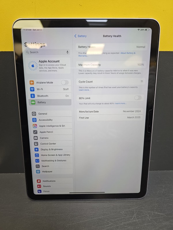 Model Name: iPad Air 11-Inch (M3) 128GB Battery Health: 100% Cycle Count: 11