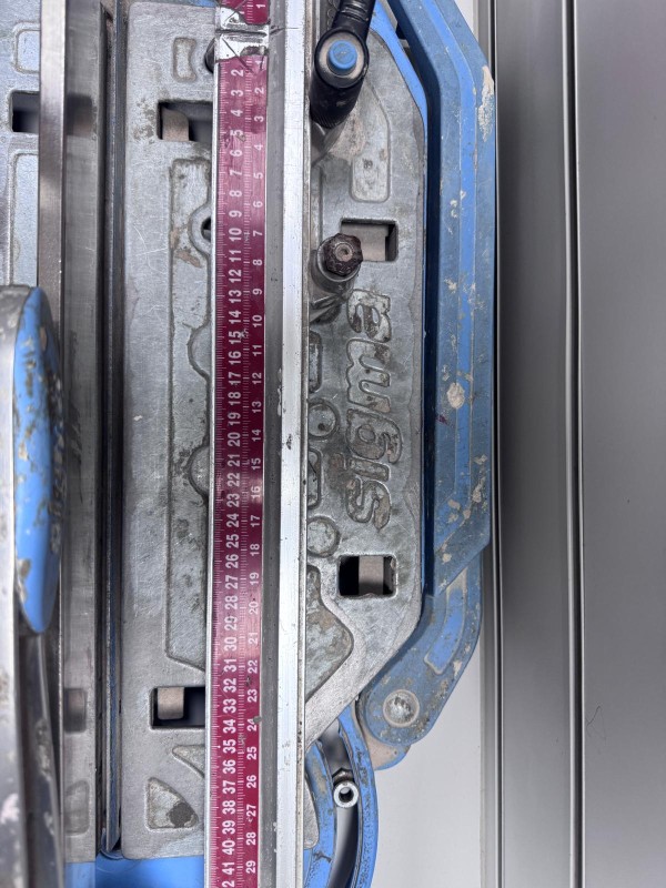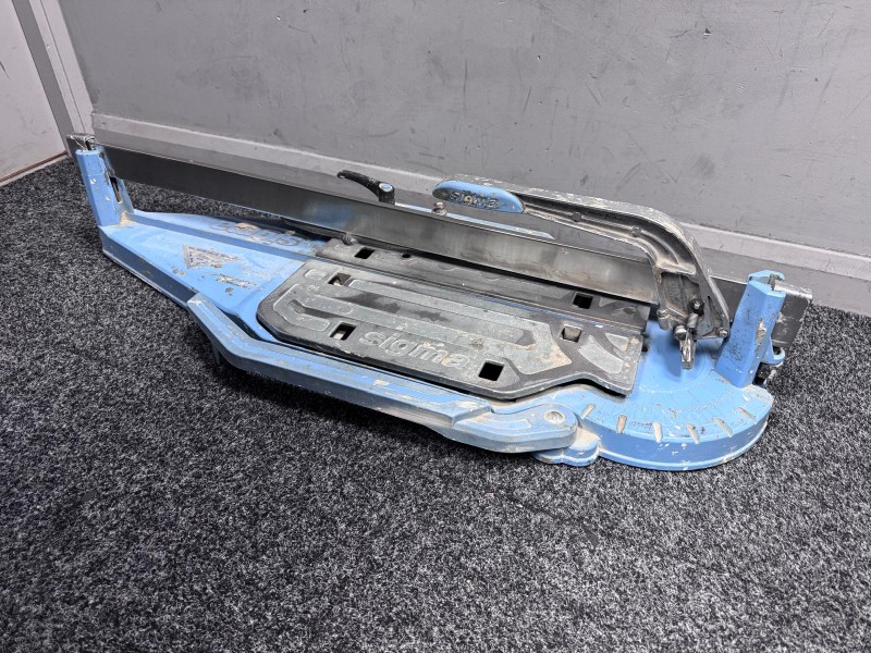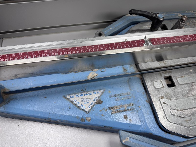 Professional tile cutter in used condition, signs of use surrounding this entire unit.