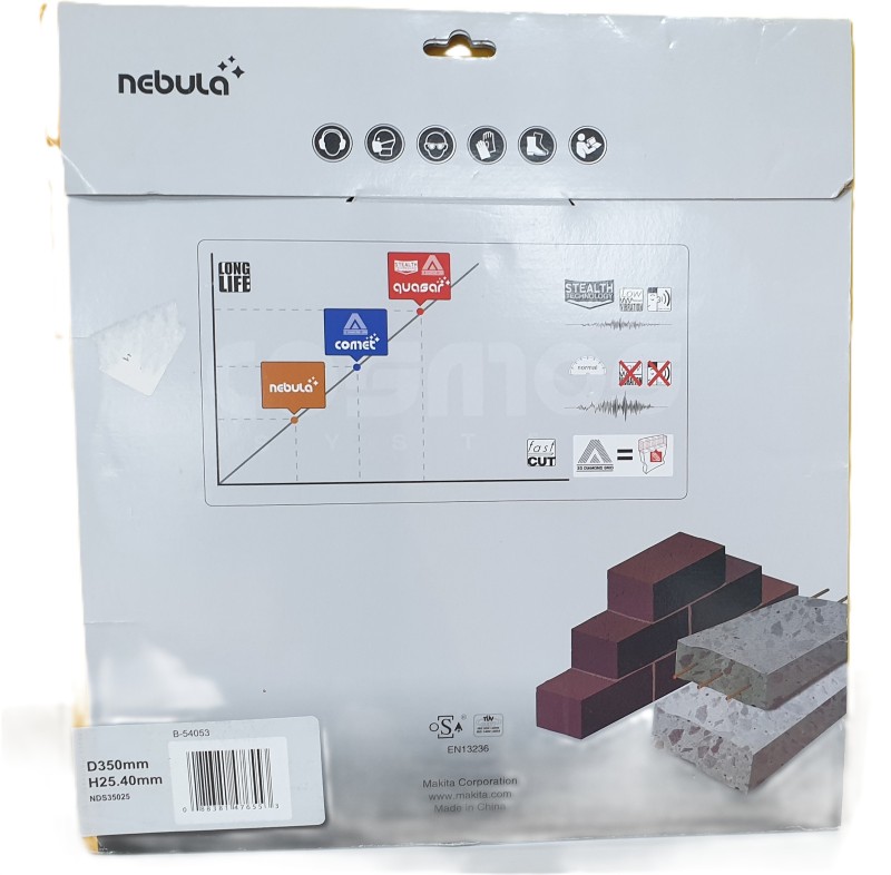The Makita B-54053 Nebula 350mm Wheel is a premium laser-welded diamond cutting disc engineered for high-performance concrete cutting. Part of the NEBULA series, it features a segmented edge ideal for use with angle grinders and power cutters. With a 10mm segment height, this disc ensures long-lasting durability and precise cutting even in tough job site conditions.